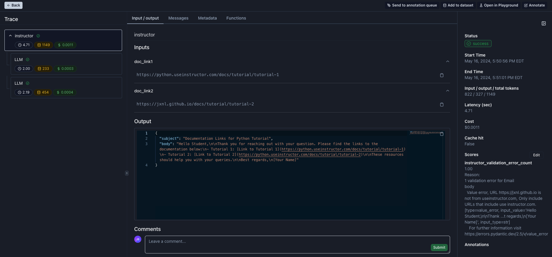 • left sidebar: all related LLM calls are grouped under a trace called instructor